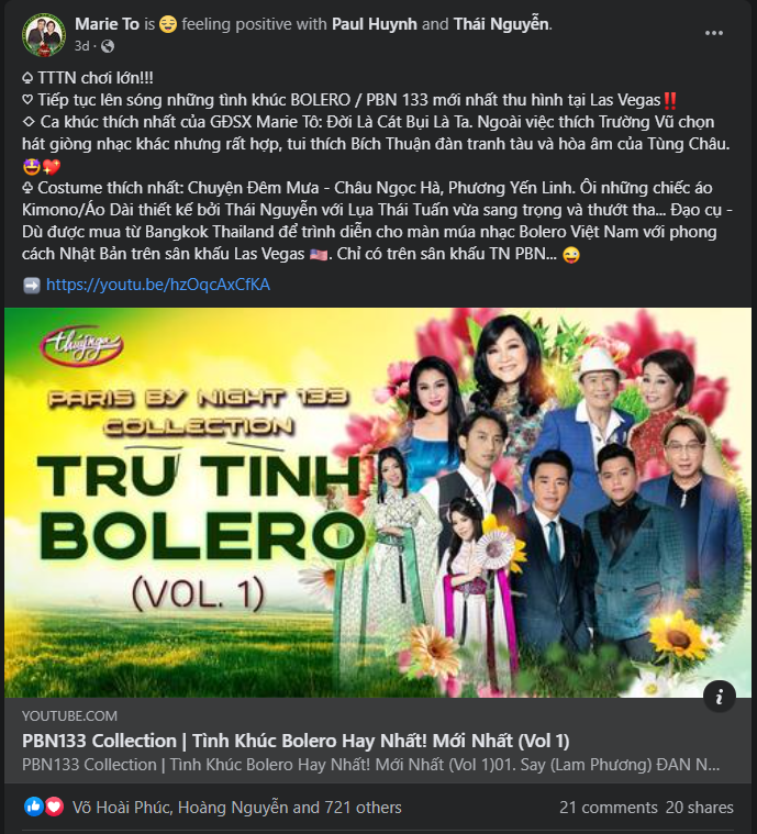 | 7 | Nhà tài trợ Diamond Tân Hiệp Phát chúc mừng kỷ niệm 40 năm Thúy Nga - Paris By Night[43] | Trần Quí Thanh, Trần Uyên Phương | |