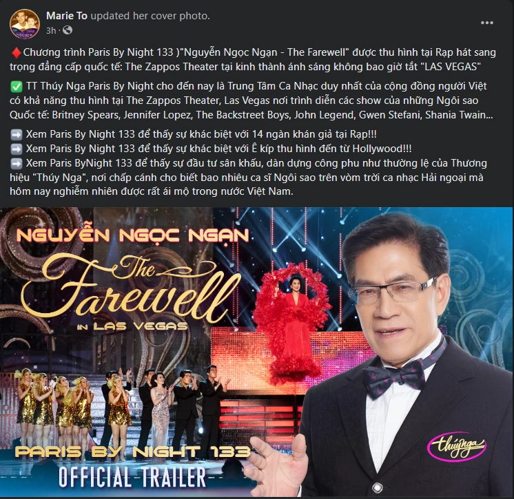 - Trong bài viết quảng cáo về Paris By Night 133 vào tối ngày 9 tháng 11 năm 2022 trên Facebook cá nhân của Tô Ngọc Thủy, cô khẳng định rằng trung tâm Thúy Nga là tổ chức người Việt đầu tiên và là duy nhất trong lịch sử người Việt hải ngoại từng thu hình ở The Zappos Theater tại Las Vegas, vốn là nơi trình diễn các show của những ngôi sao ca nhạc quốc tế như Britney Spears, Jennifer Lopez, The Backstreet Boys, John Legend, Gwen Stefani, Shania Twain...[60]